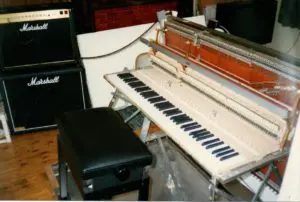 Digital sampling was the latest development in keyboard technology back then, but I had found that samples of electric guitar did not sound authentic enough, even just in terms of their pure tone quality. Eventually all this led to one of those “eureka” moments in which it became clear that one way to get what I was after, would be to take a more “physical” approach by using a set of piano keys and the “action” and “dampering” mechanism that normally comes with them, and then, using planks of wood to mount on, swop out piano strings for those from an electric guitar, add guitar pickups, wiring and switches, and so on – and finally, to send the result of all this into a Marshall stack.